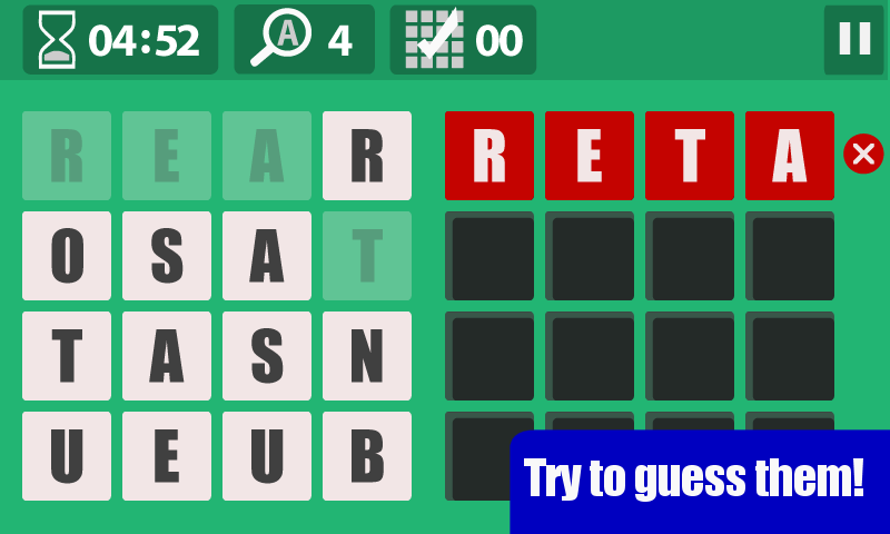 4 words, of 4 letters each are jumbled together on the left side of the screen. Tap the letters to form the words on the right side - and be fast: you have only 5 minutes to find out the solution!