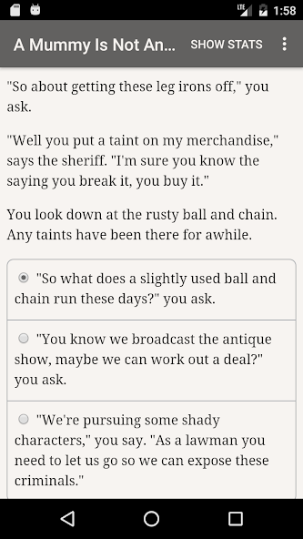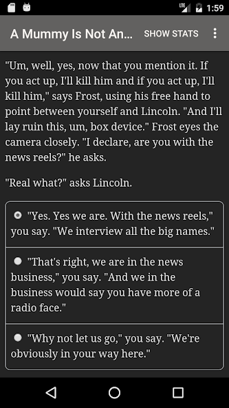 "A Mummy Is Not An Antique" is a 52,000 word interactive novel by Randy Condon, where your choices control the story. It's entirely text-based—without graphics or sound effects—and fueled by the vast, unstoppable power of your imagination.