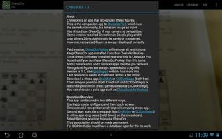 يستخدم هذا التطبيق الكاميرا للتعرف على مخططات الشطرنج في الكتب باستخدام التعرف على الأحرف البصرية (OCR). يحفظ كل مخطط معترف به في ملف PGN ، ويضع أيضًا أحدث مخطط في الحافظة كسلسلة Fen. يمكنك بعد ذلك استدعاء برنامج شطرنج مثل Droidfish ، أو Scidonthego مباشرة لتحليل الموقف أو إجراء بحث قاعدة بيانات عن الألعاب التي تحتوي على هذا الموقف. للحصول على أفضل النتائج ، يجب أن يأخذ الرسم التخطيطي نصف عرض الكاميرا على الأقل ، ويكون الكتاب مسطحًا بشكل معقول (هناك بعض التعويضات لالتقاط الصفحة). إنه يعمل بشكل أفضل بالنسبة للكاميرات التي لديها إمكانيات ضبط تلقائي للصورة ، ولن تعمل بشكل جيد على الكاميرات التي لا تستطيع التركيز التلقائي. أيضًا ، بعض الكاميرات ليست حساسة للغاية للضوء وتتطلب إضاءة خلفية مشرقة ، في حين أن البعض الآخر يعمل بشكل جيد حتى في ظروف الإضاءة المنخفضة.