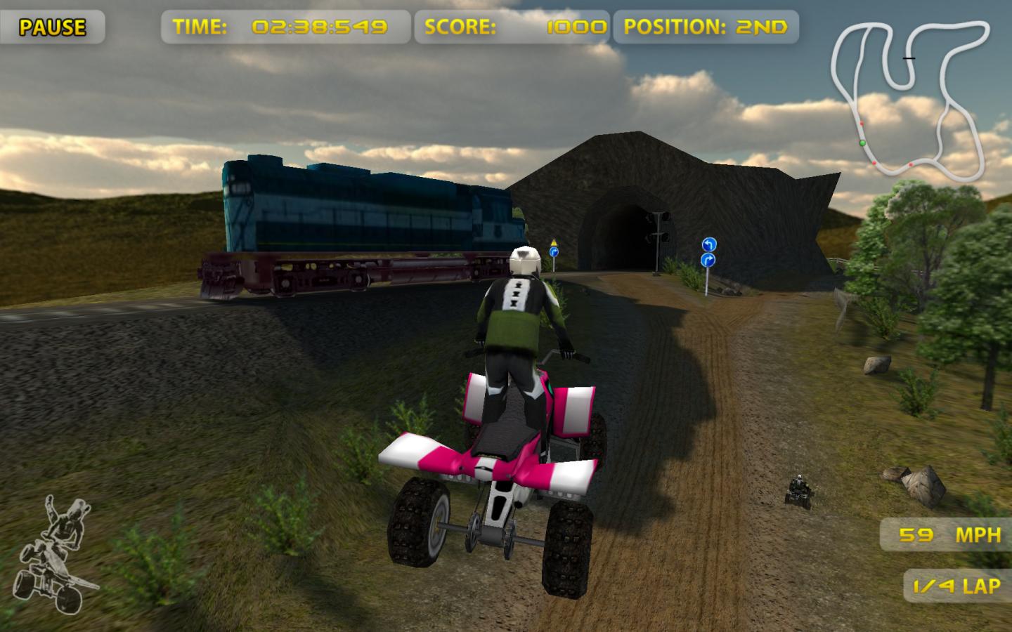 Make tricks to earn extra-credits to unlock vehicles and tracks! Feel the realism of the full 3d outdoor environments with 5 long tracks and 12 ATV models coming with different power,grip and brake settings. Enter the game right from the beginning with the stunning 3d menu replicating the real scene of a race backstage!