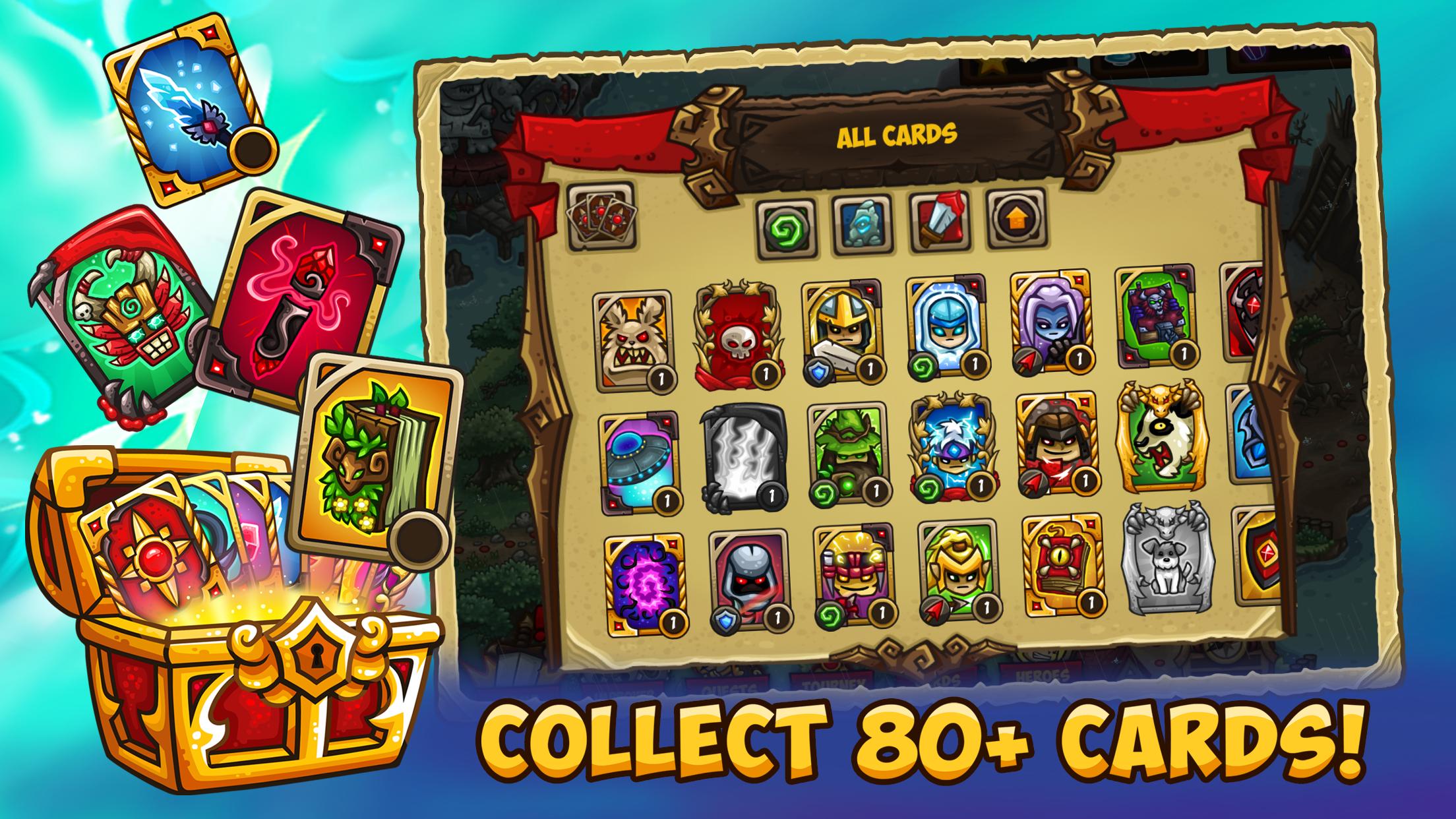 • Ccg cards! Over 80 unique ccg cards to collect (weapons, upgrades for towers, magic, kings, pets)