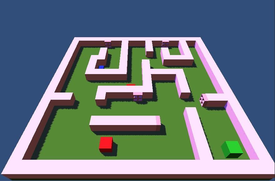once hero (blue cube) reaches / touches queen (green cube) next level will start, there are only three levels as of now and the main menu is also not complete