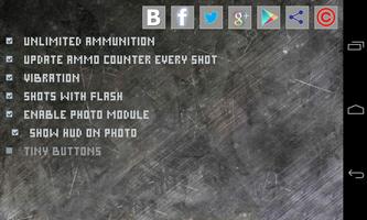 Um zwischen Waffentypen zu wechseln, müssen Sie nur von links nach rechts oder von rechts nach links auf den Bildschirm wischen. Um sich zwischen Waffen zu wechseln: Wischen Sie von unten nach oben oder von oben nach unten. Jedes Mal, wenn Sie die Waffe in der linken Ecke wechseln, sehen Sie einen Indikator für die aktuelle ausgewählte Waffe. Indem Sie diesen Indikator berühren, können Sie auf "Waffenkarte" zugreifen, wenn Sie die Möglichkeit haben, Waffen zu ändern, indem Sie darauf klicken. Sie können auf dem Bildschirm mit der rechten Mitte aufnehmen, indem Sie die Taste-Taste mit der rechten Mitte berühren. Wenn Sie die Schaltfläche "Weapon Touch Circle" auf der Bildschirmseite rechts neu laden möchten (auch Zähler der verfügbaren Munition in dieser Ecke). Wenn Sie sich im dunklen Raum befinden, können Sie die Taschenlampe einschalten. Sie können die Auswirkungen des Schusses anpassen, indem Sie das Ziel in der Bildschirmzentrale berühren. Wird geöffnet Effekte eingerichtet, in dem Sie können: Ein/Aus -Funken, Mündungsblitz und Blut. Um dieses Menü zu beenden, tippen Sie einfach von Tasten. Sie können zu jedem Zeitpunkt des Spiels ein Foto oder Video aufnehmen, indem Sie eine Kamera-Taste in der Mitte-Links-Seite des Bildschirms berühren. Um zwischen dem Foto- und Videododus zu ändern, berühren Sie einfach das Foto-/Video -Symbol über der Schaltfläche Capture. Wenn Sie im Fotomodus eine einfache Fortschrittsbal angeben, geben Sie die Verarbeitung eines Fotos an und haben sich beim Überbinden versteckt. Wenn Sie im Video -Modus warten, müssen Sie warten, bis der gesamte Prozess durchgeführt wird. Während das Videomodul ein Video vorbereitet, können Sie im Fotomodus wechseln und Fotos machen. Sie können Fotos sofort in der integrierten Galerie verwalten (greifen Sie aus dem Hauptmenü auf sie zu). In der Galerie können Sie Fotos anzeigen, löschen oder teilen: Allshare, Bluetooth, Cymera, Drive, E-Mail, Facebook, Google Mail, Google+, Instagram, Messaging, Photo Editor, Picasa, Social Hub, Twitter, WhatsApp, Wi-Fi Direct und jeden anderen sozialen oder Messaging-Service, den Sie auf Ihrem Gerät installiert haben. Tippen Sie auf Foto oder Video, um es auszuwählen, wenn Sie es löschen möchten. Im Optionsmenü können Sie die Größe der Schaltflächen im Spiel einrichten, ein/aus -Vibration einstellen, Schaltflächen zeichnen oder es im Moment des Capture -Fotos verbergen, ein wenig Leistung für langsame Telefone erhöhen und vollständige Informationen über Armed Cam und Shunamicode finden, Spiel teilen, ChangeLog lesen und den Howto -Modus einschalten. Indem Sie "Statistiken" berühren, können Sie sich ansehen, wie viele Kugeln Sie schießen, sie und andere Dinge teilen.