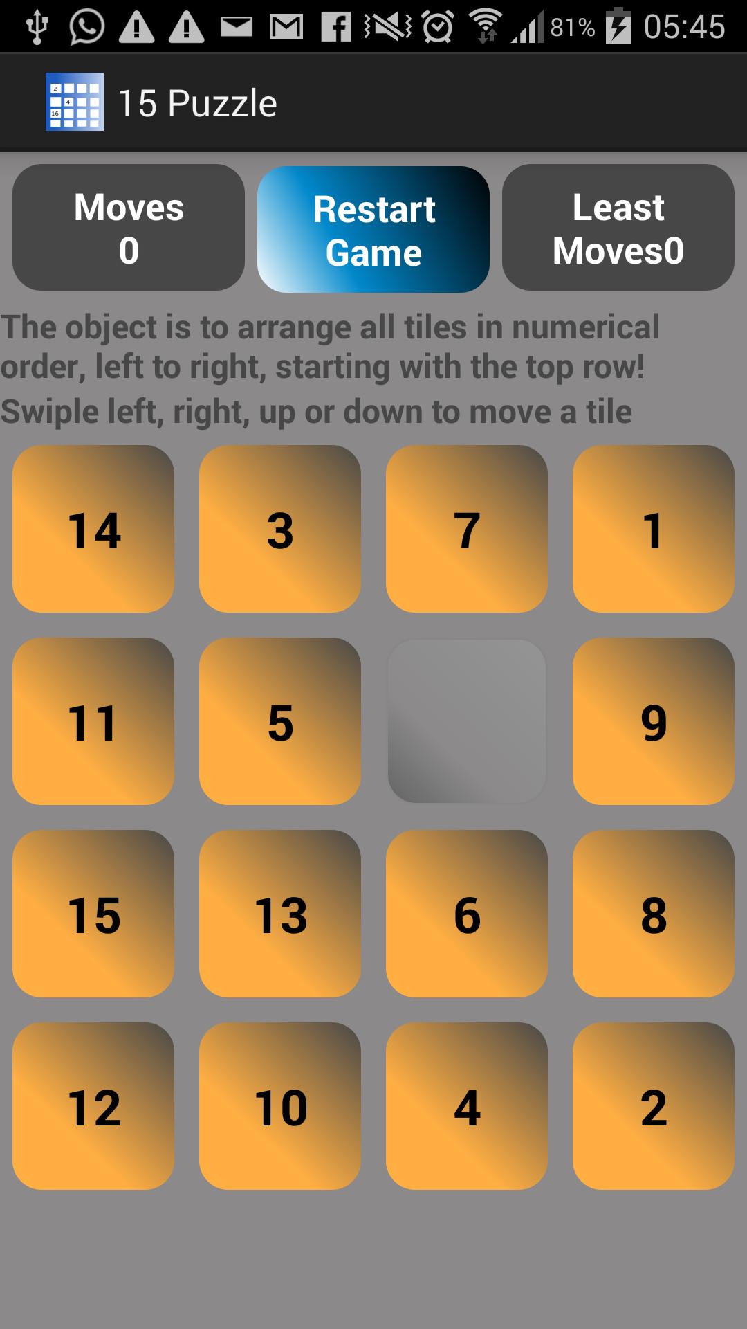 Sobald Sie damit beginnen, es zu spielen, können Sie eine gute Stunde damit verbringen. Es ist eine Herausforderung, da Sie sich Ihre eigenen Strategien einfallen lassen würden, um Fliesen zu bewegen und sie in Einklang zu bringen. 15 Puzzle -Free -Spiel wird in Kürze um die Rangliste erweitert und damit die Spieler ihren Erfolg auf Facebook mit Freunden und Familie teilen können.