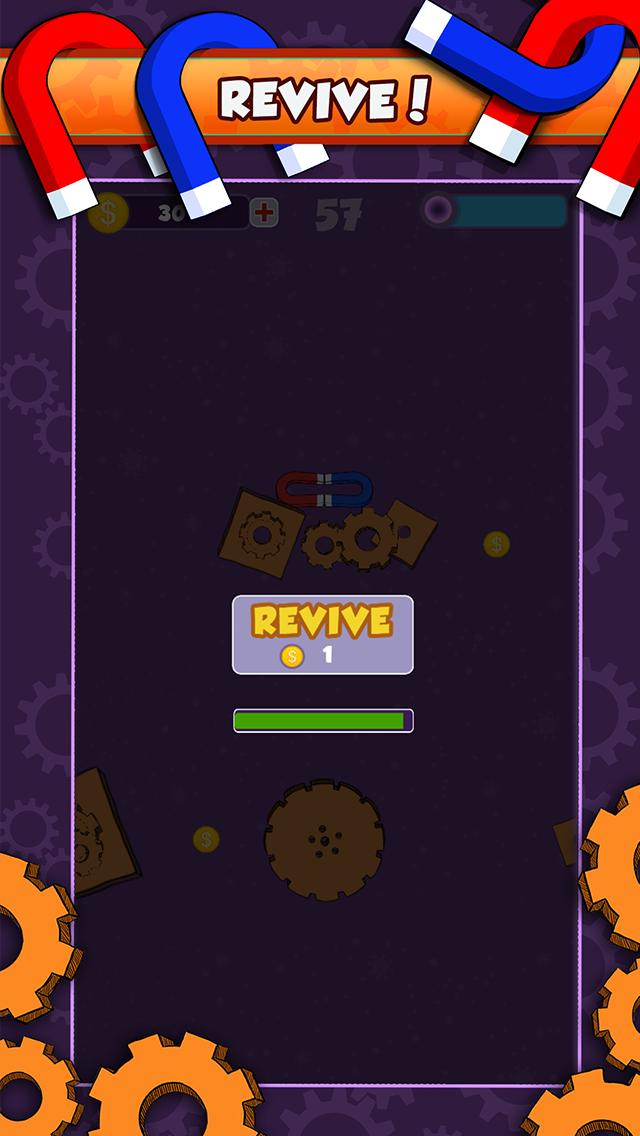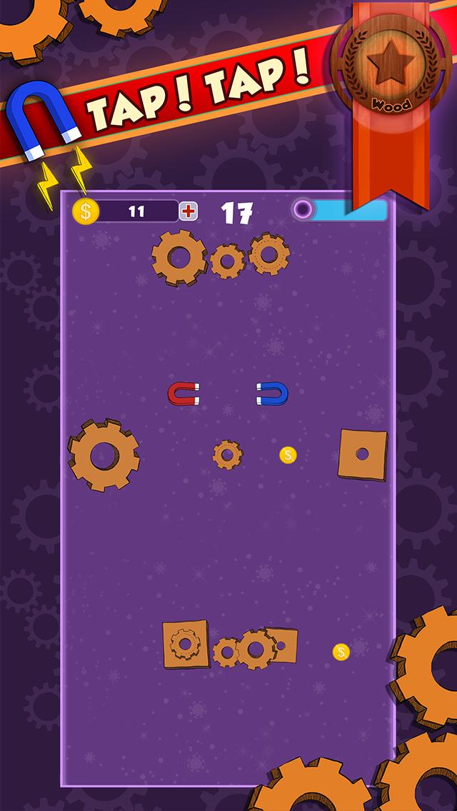 Erleben Sie das Abenteuer des Tap Tap Magnet , den fallenden Magneten durch die Welt der Zahnräder und Räder. Tippen Sie auf den Bildschirm, um Magnete abzuwehren und Hindernisse zu vermeiden.
