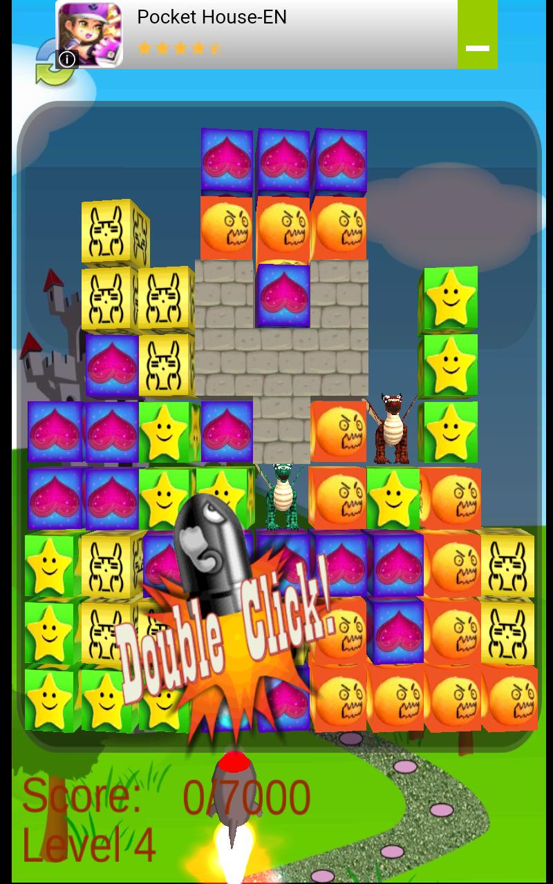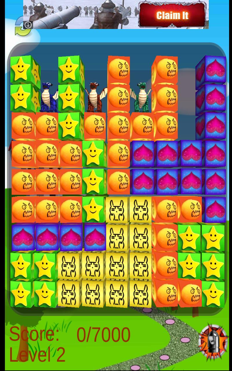 Your mission is very simple. You have to bring the dragons back to ground by destroying the color boxes. When two or more color boxes are together, you can destroy them. Each time destroying them, you will have 500 points, and each time bringing a dragon back to ground successfully, you also have 500 points. Each Level will have a help is a . To use it, you click on the rocket icon in the bottom of the screen and select the location to fire. Double kick to the rocket to fire it. Pay attention that when using the rockets, you will be penalized 2000 points.