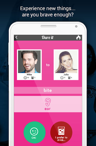 ✔ DARE IT: Let’s get naughty... Have you ever wondered how it feels to bite your shy friend’s neck? To caress her thick long hair? Lick a shoulder? Well, now you have an excuse to do it without looking like a total weirdo. Dare, or drink.