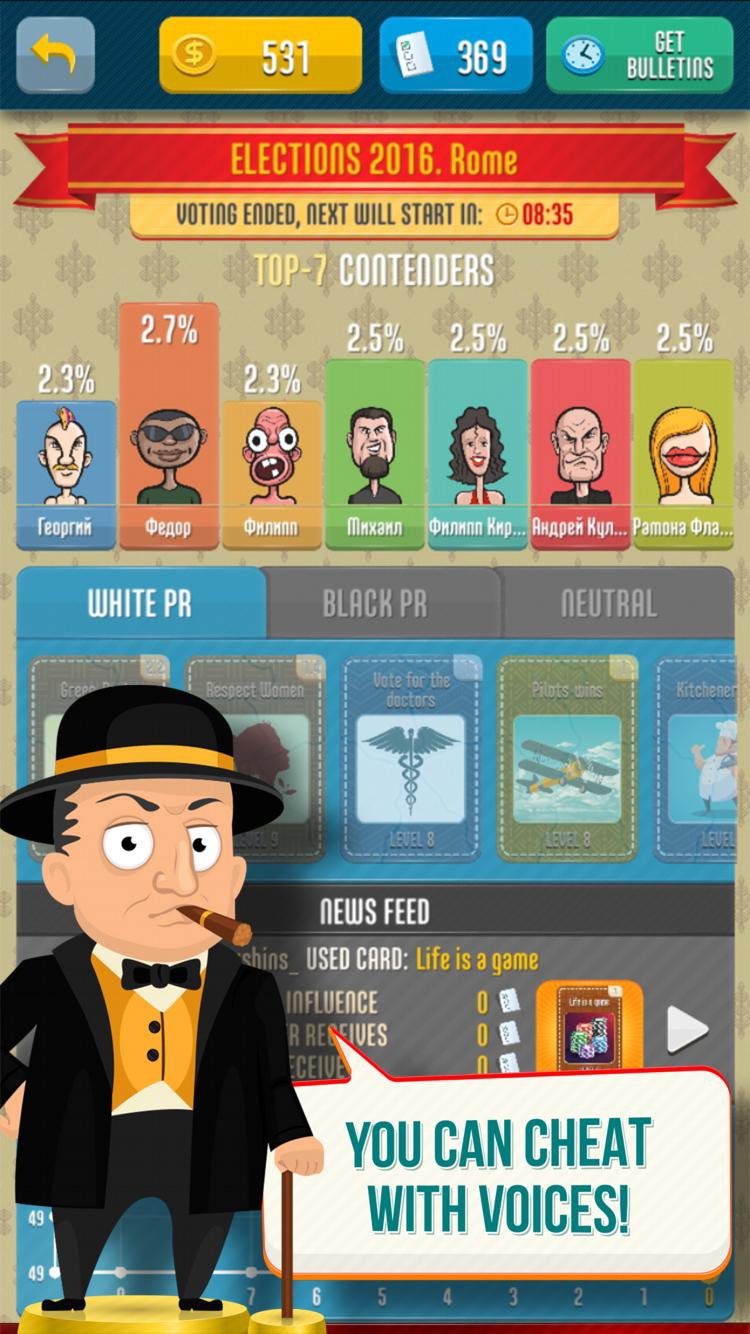 In the Simulator Elections game you have to plunge into the vicissitudes of the Election campaign. As in real life, you start playing from the lowest rank in the policy. You recently joined the party at the deputy assistant position. No one knows you yet and there is no chance to win Elections even in the run-down town.