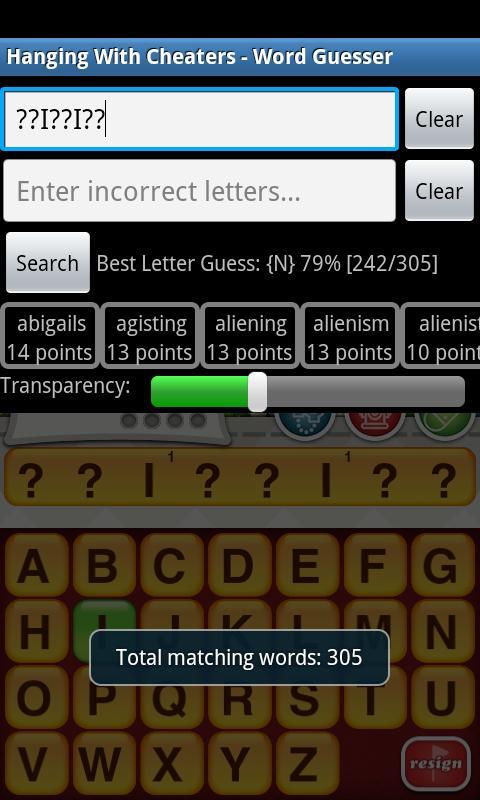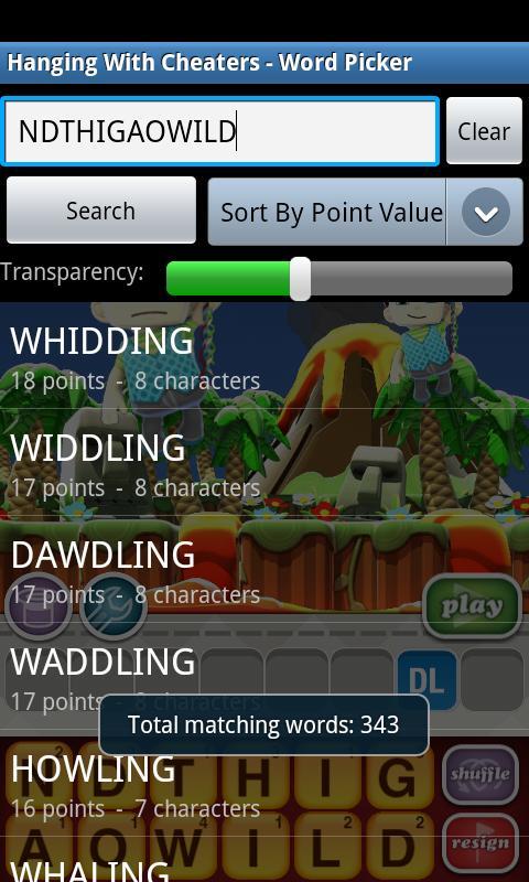 Use la capacidad de Android Múltiple de tarea para alternar entre su juego de palabras y colgar con tramposos y luego use el control deslizante de transparencia para ver el juego de palabras en segundo plano.