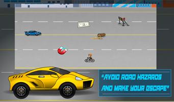 Su objetivo es alejarse de los policías y debe conducir su vehículo sin golpear derrames de petróleo, letreros de peligro de carretera, tiras de picos y ciclistas en la carretera. Complete la misión y luego diríjase al garaje para desbloquear una variedad de vehículos (automóvil deportivo, automóvil de lujo, gran actualización, medianos o pequeños) a 4 autos diferentes e incluso una motocicleta disponible, ¡con el dinero que gana puede actualizar su vehículo, además de ganar todos los logros!