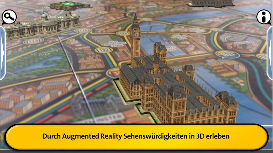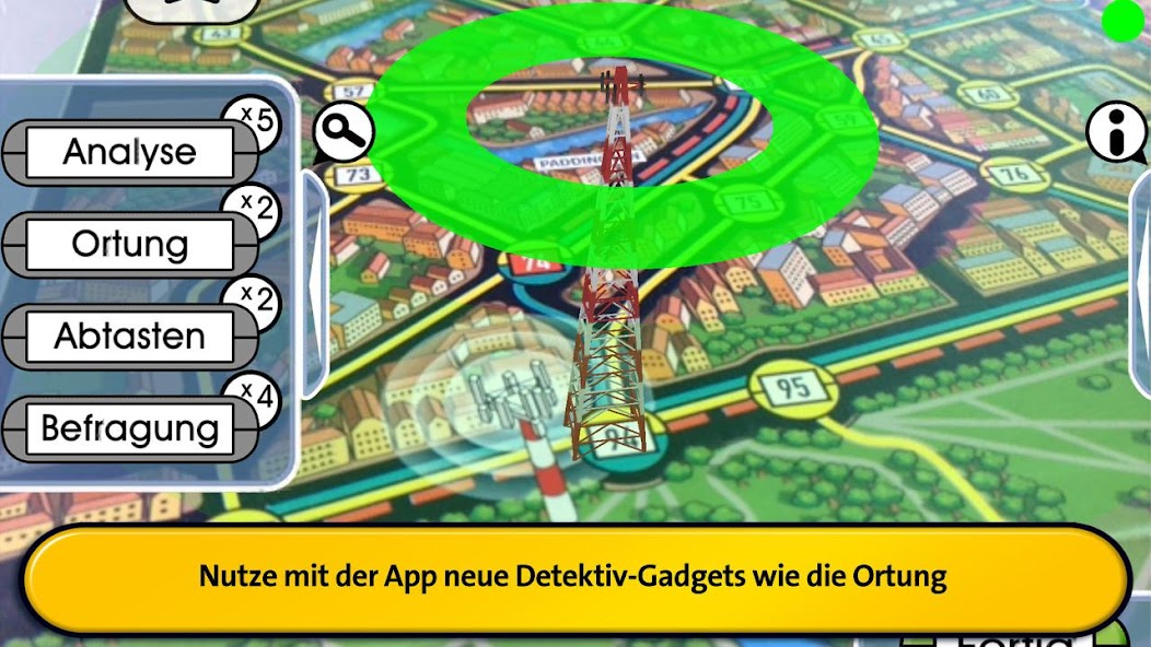 Junto con el juego de mesa, esta aplicación ofrece una forma completamente nueva y aún más emocionante de jugar. Los detectives están a la vanguardia de la tecnología e incluso más calientes en los talones del Sr. X. Encontrarán toda la información importante en el centro de control digital: ¿qué modos de transporte ha viajado el Sr. X hasta ahora? ¿Cuándo se volverá a mostrar? ¿Qué acciones especiales se pueden usar? Puede seleccionar el seguimiento del teléfono móvil, por ejemplo, y señalar el teléfono inteligente o la cámara de la tableta en los cuatro mástiles de radio en el tablero de juegos. Las ondas de radio verde, amarilla o roja indicarán si el Sr. X está cerca o no. También puede interrogar a testigos en edificios importantes de la ciudad. La cámara entra en juego nuevamente, mostrando a Tower Bridge, las casas del Parlamento y la Catedral de San Pablo en 3D. Los testigos revelarán si el Sr. X está o ha estado allí recientemente.