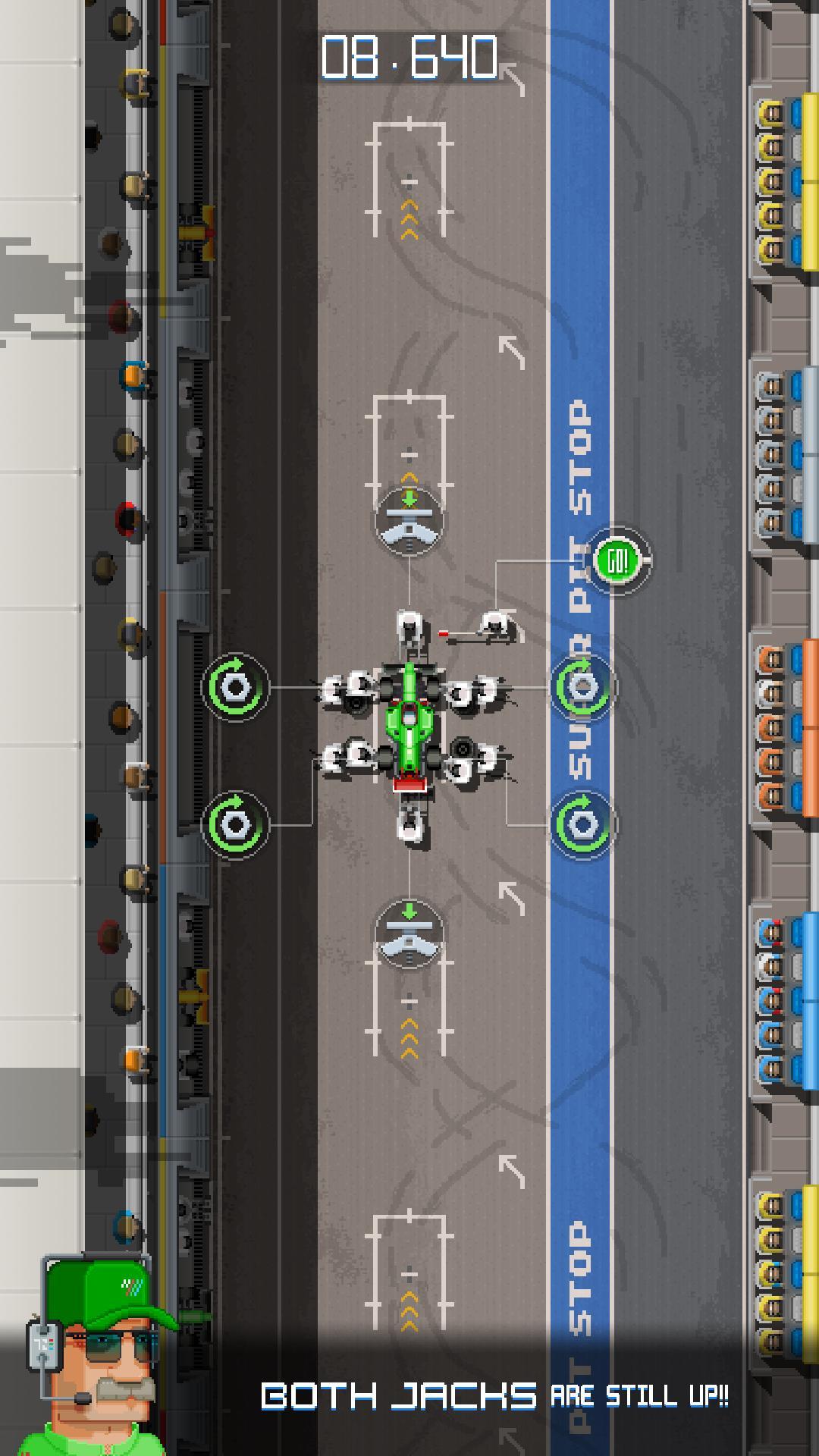 Siente la avalancha de adrenalina cuando su conductor se acerca a la caja de boxes, levante el automóvil en sus gatos, cambie cada rueda desbloqueando y apretando cada tuerca de rueda, ¡antes de finalmente bajar la piruleta para enviar a su conductor de regreso a su camino!