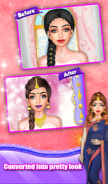 Et puis visitez la salle de maquillage indienne et aidez-la à sélectionner des accessoires de maquillage attrayants comme un objectif pour les yeux, des sourcils, des coiffures, un ombre à paupières, un fard à joues, un rouge à lèvres, des mascaras, une peinture à ongles et bien plus encore. Après cela, il est temps de choisir une robe indienne pour elle comme un sari indien traditionnel, un collier, des boucles d'oreilles, des bindi et bien plus encore. À la fin, n'oubliez pas de prendre une photo de mariage indienne incroyable et de la sauver dans la galerie de téléphones. Avec ce jeu de relooking indien, vous pouvez apprendre le maquillage pour la peau indienne et les femmes indiennes.