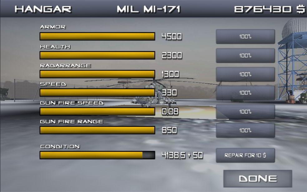 • Upgrade of the helicopter: With every fight helicopters, armor, health, radar range, speed and cannon can be upgraded with the money from playing.
