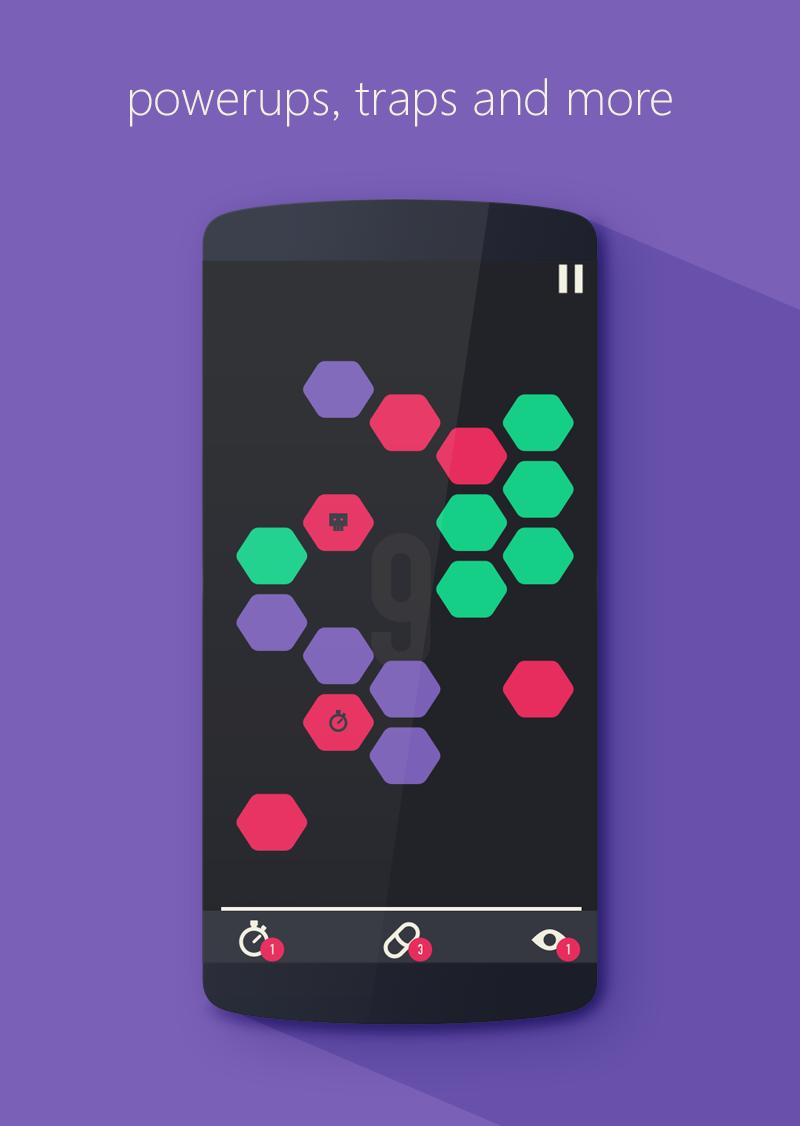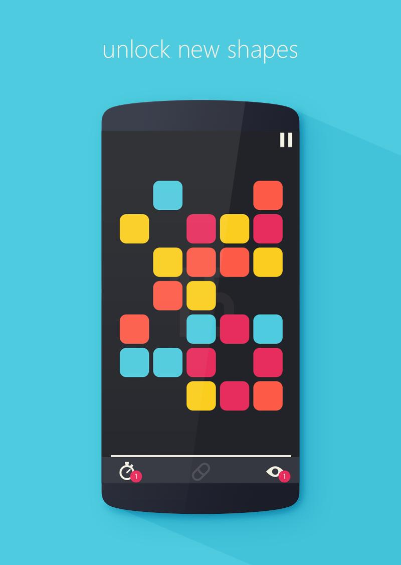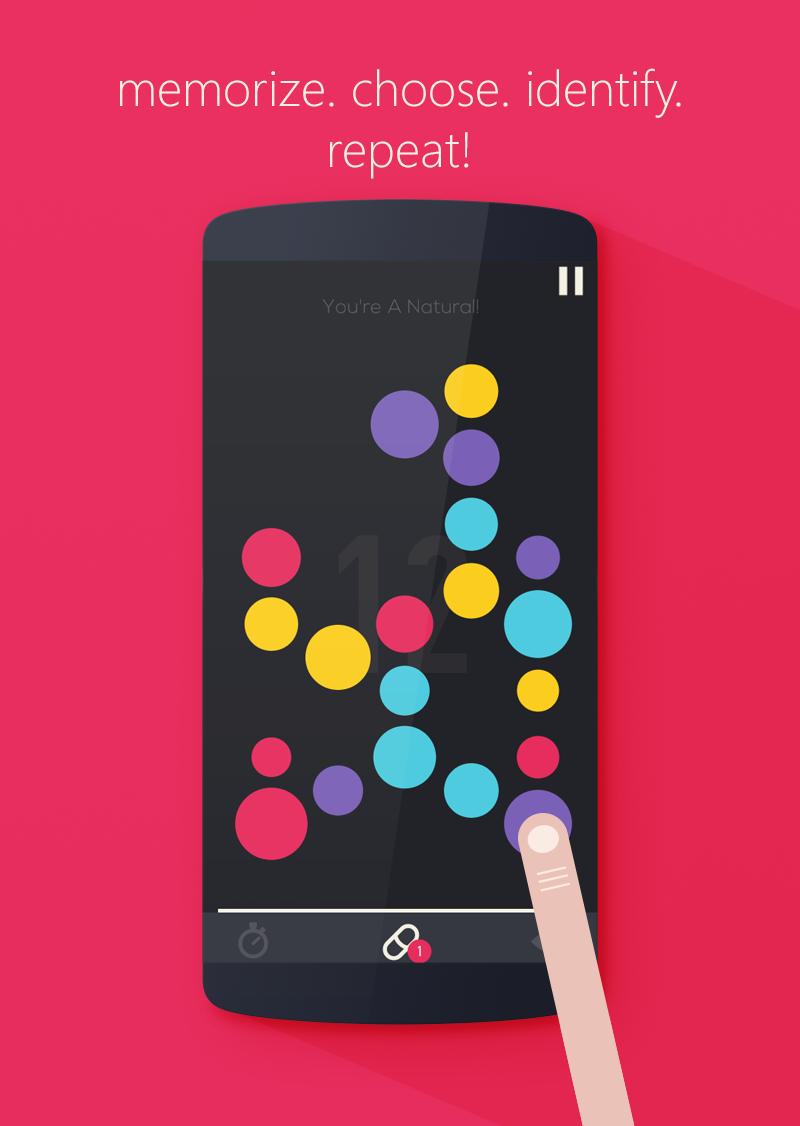 From the beautifully arranged colored shapes on screen, you have to memorize the positions of a color you want to progress with and chose that color. Once you chose the color, all the shapes turn into silhouettes and you have to run up your short term memory and locate the shapes of the chosen color by tapping on them. Tapping on wrong color is bad and there is a progressive timer which awards you for completing levels fast. As you progress, the difficulty increases and comes the additional challenges and unforgiving traps.