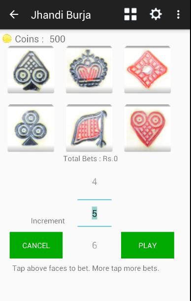 3. Pengguna dapat mengetuk wajah apa pun di antara enam wajah untuk bertaruh. Pengguna dapat bertaruh pada sejumlah wajah tetapi setidaknya satu wajah harus dipilih untuk melanjutkan. Satu ketukan membuat jumlah taruhan sama dengan kenaikan yang diberikan di layar. Lebih banyak ketuk pada wajah yang sama meningkatkan taruhan dengan peningkatan yang diberikan. Misalnya mengetuk dua kali pada wajah burja dengan Increament 5 akan membuat taruhan total pada Burja dari jumlah 10. yaitu (5+5 = 10). Anda dapat mengubah peningkatan juga pada setiap keran atau taruhan. Seperti (5+10 = 15) untuk dua ketukan.