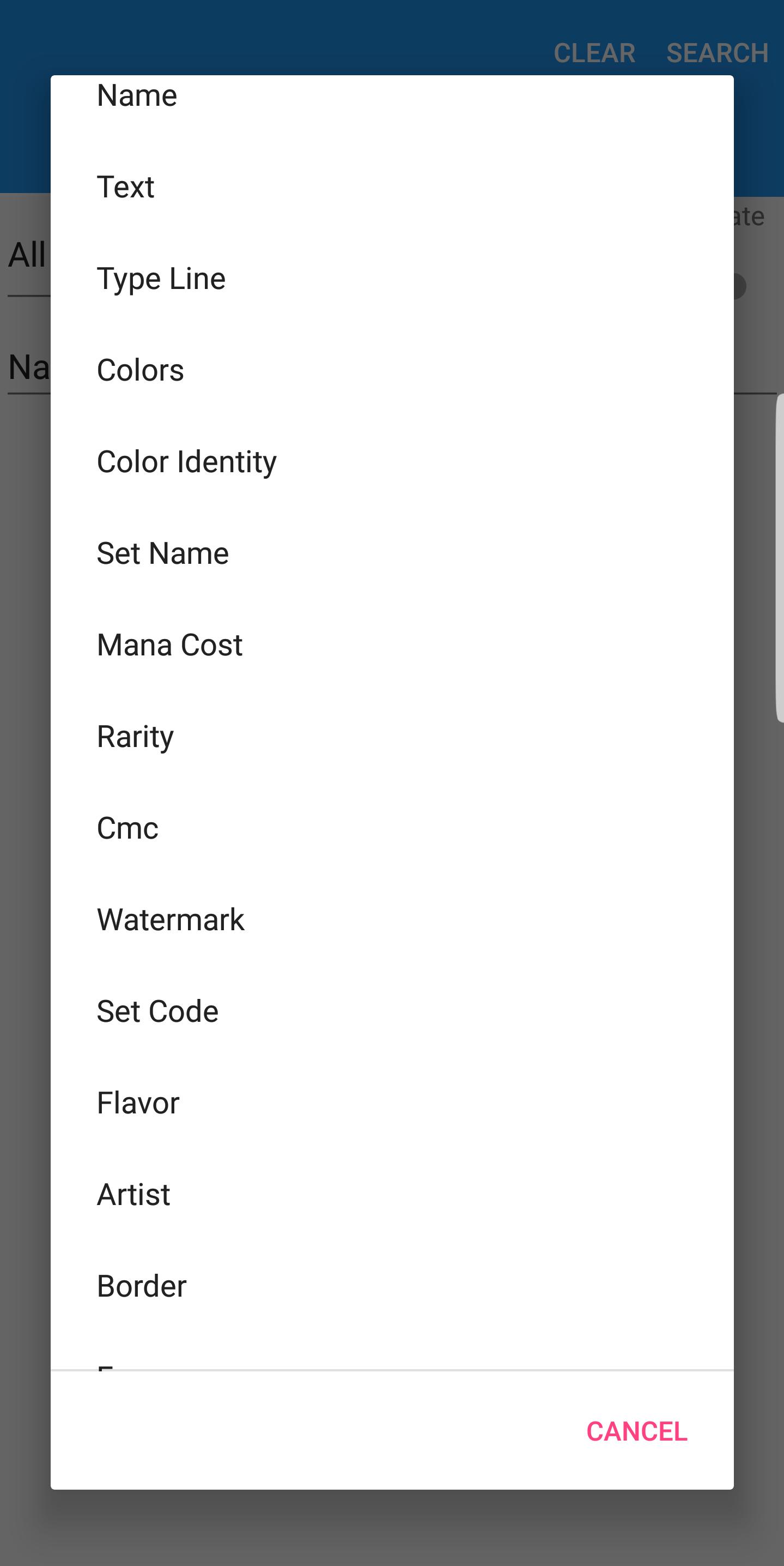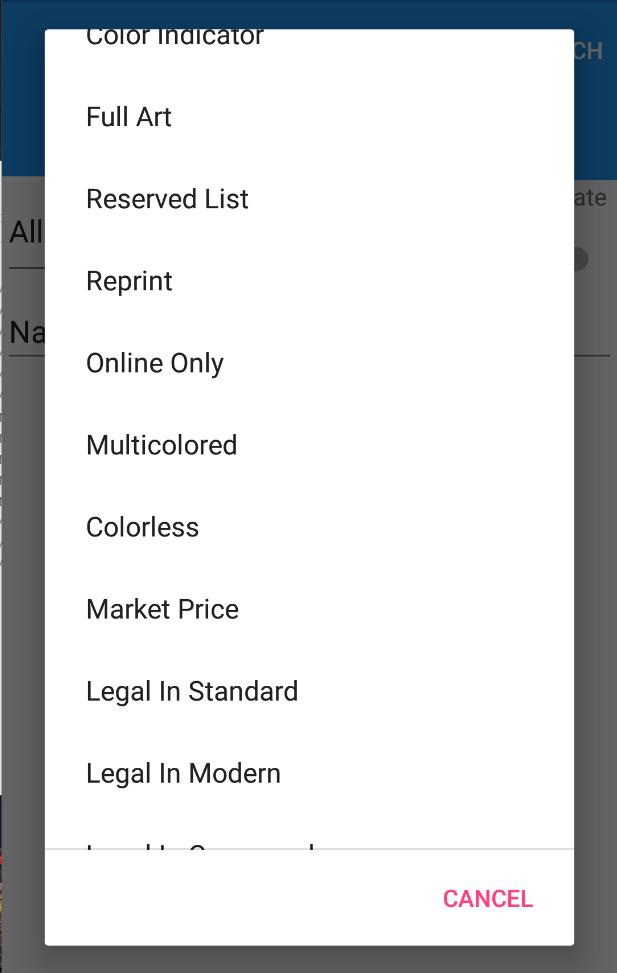 Anda dapat mencari dengan hampir semua kriteria yang dapat dimiliki kartu, seperti nama, jenis baris, setel nama, biaya mana, teks rasa, seniman, identitas warna, tanda air, CMC, kelangkaan, dan banyak lagi.