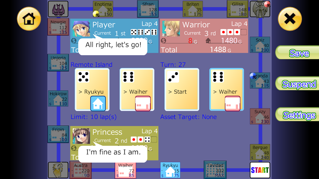 카드를 선택하고지도를 진행하십시오. 공간에 착륙하면 어떤 일이 발생하거나 부동산을 살 수 있습니다.