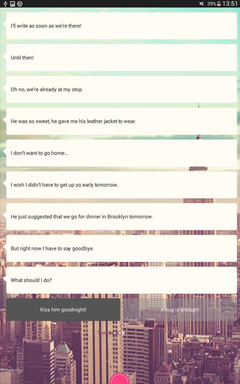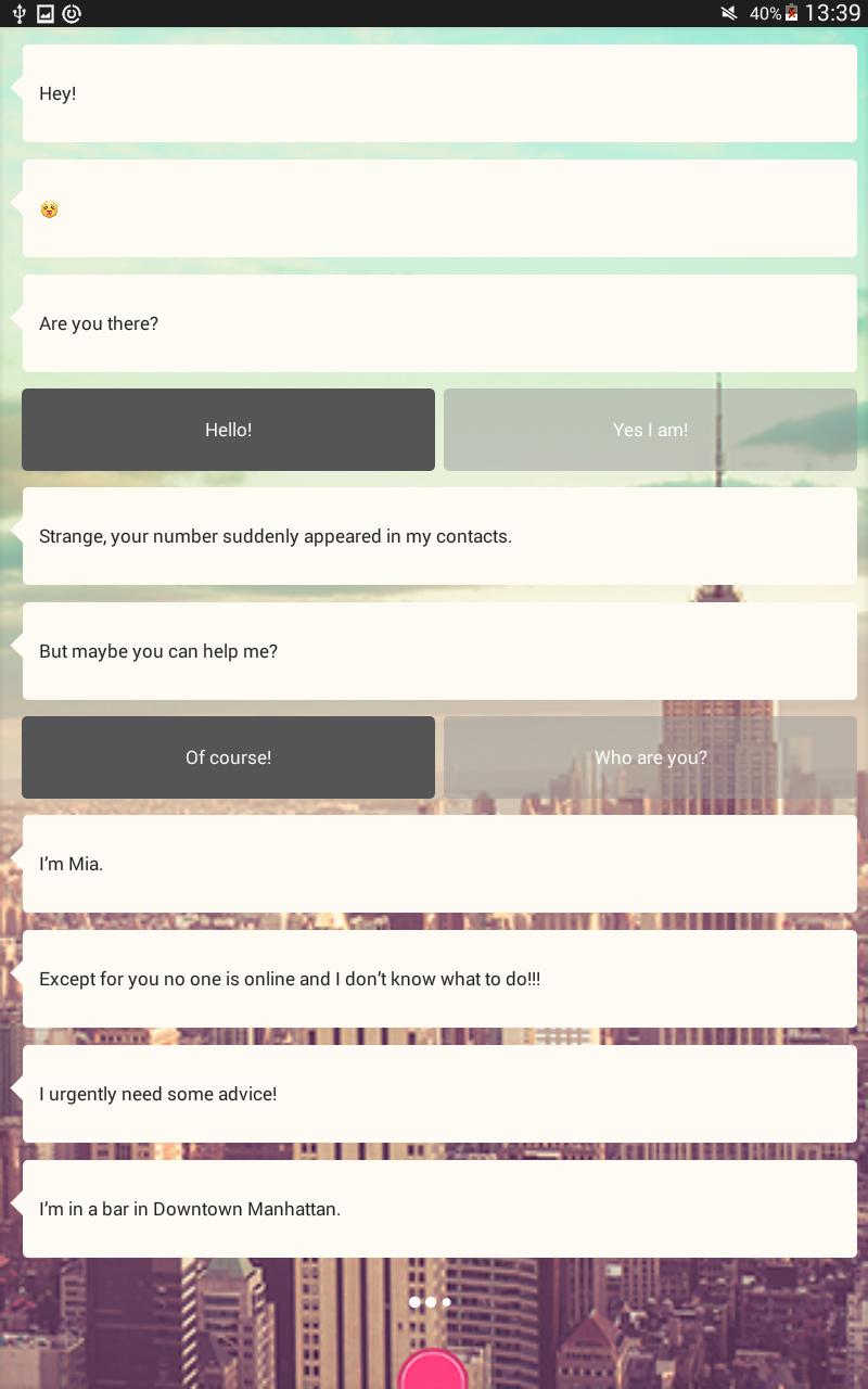 Mia's messages reach you directly from Manhattan in real time. You have a choice: answer immediately or at a later date. Mia asks you questions and your answers will decide how she proceeds.