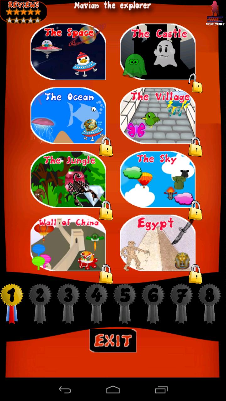 1. Space : Mavian discovers a new Galaxy and then, suddenly, he is attacked by some aliens who want to get the hidden treasures to be found there. To pass the level you will have to manage to be faster than them, get treasures and try to avoid them. Having achieved his first medal, Mavian can move to the the next mission.