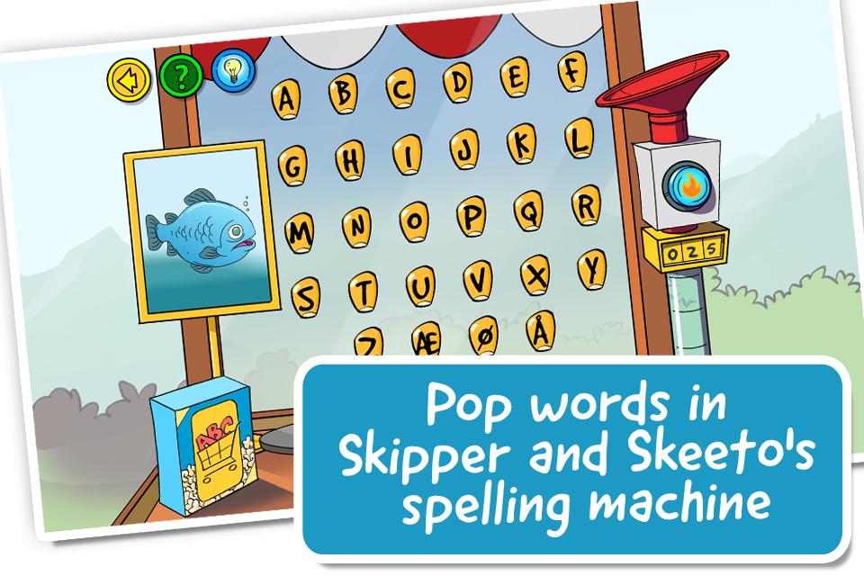 Here you can pop popcorn by spelling the things you see on the drawing. Drag the corn down into the red bowl and click on the flame button when you are ready. If the word is correctly spelled, the corn will pop. It is possible to buy more words by clicking on the package at the bottom to the left.