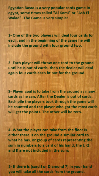 8- também na situação anterior acontece e o jogador tem Diamond 7, ele levará as cartas no chão como "Basra". Diamond 7 é um cartão especial que tem 2 papéis chamados por egípcios "Al Komi"; o outro nome do mesmo jogo; Será necessário Basra de qualquer valor ou, como J, assumirá todo o terreno.
