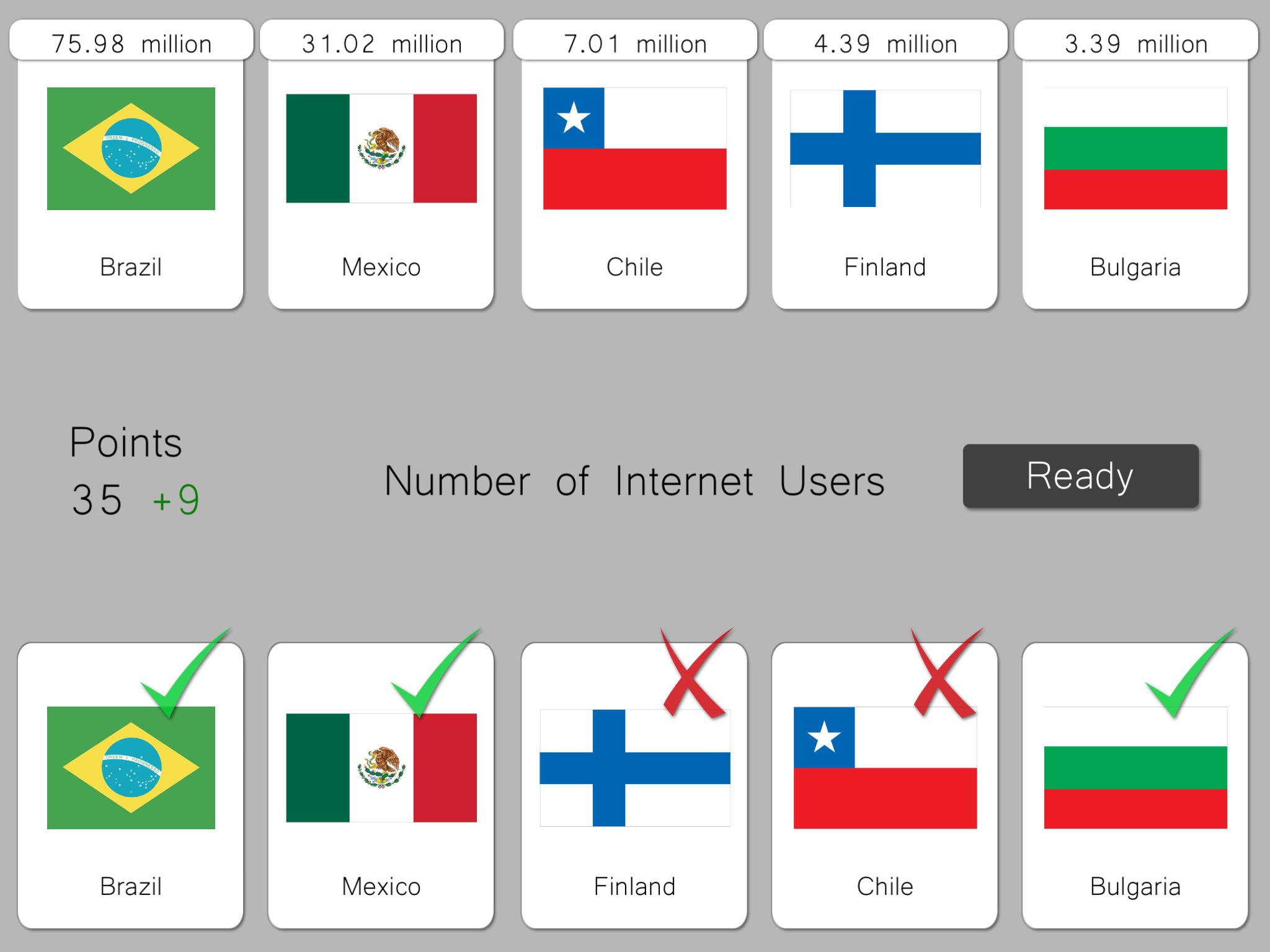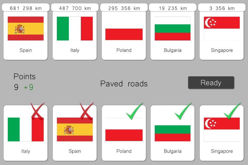 Depending on the level you have a certain amount of time to rank four to five countries according to a specific value like area, population or birth rate. The solution shows you whether your estimation was right. You get points for every correct ranking but be careful, if the ranking is completely wrong points will be withdrawn.