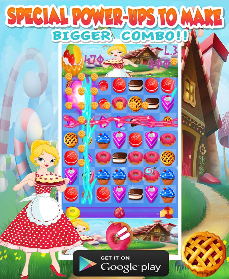 С более чем 300 сложными уровнями бесконечных развлечений, особых сил, чтобы сделать еще большую комбинацию, нажимать на подходящую выпечку и куки, чтобы очистить их до того, как будет время. Помогите милой леди собрать все пироги, сопоставляя 3 выпечки, а также, пройдя через удивительное приключение сумасшедших кухонных островов, остановите жажду и завершит сложные уровни. Также вы можете присоединиться к режиму бревному разрыву, что станет более сложным и сложным, но как только вы заскочите, вы не можете остановиться!