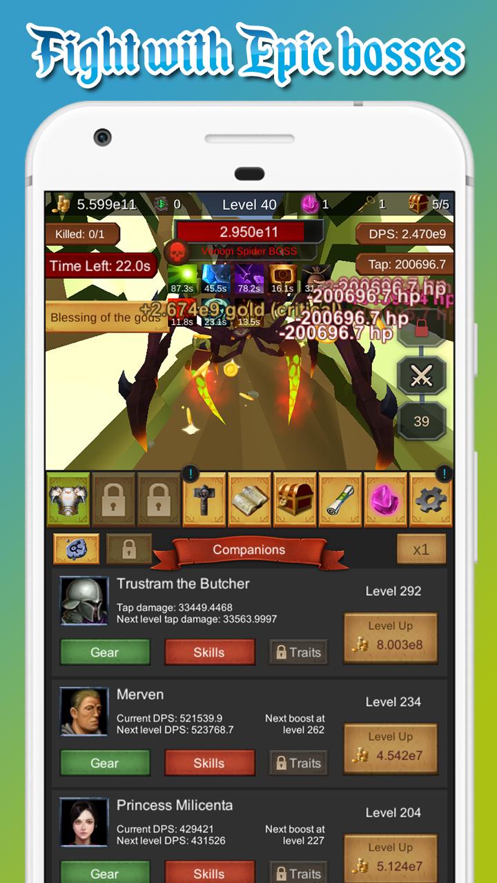★ Нанимайте компаньонов, чтобы помочь вам в вашем путешествии, убить монстров и боссов, чтобы собрать золото и купить обновления.