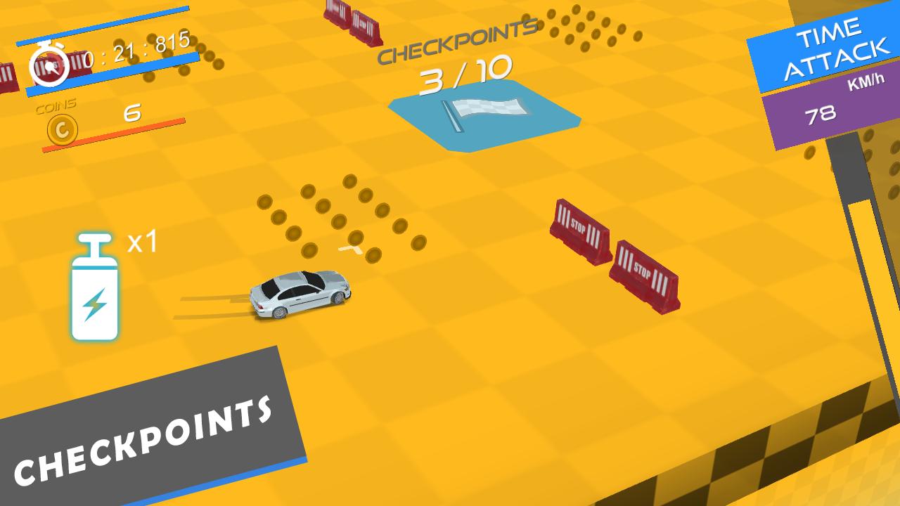The clock is ticking. Rush yourself in completing any level as fast as possible and make as higher score as possible. Earn coins to unlock new cars and levels or upgrade and customize your car of choice.