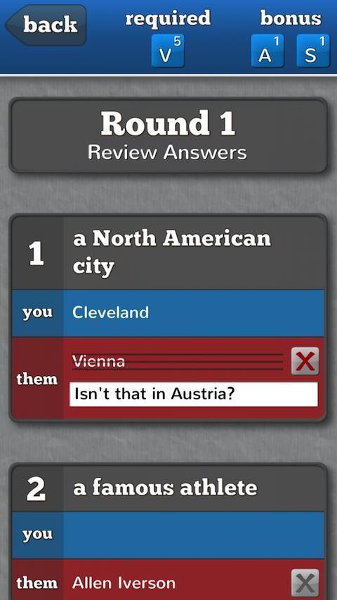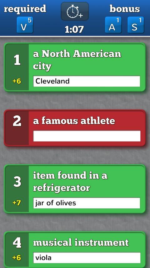 ด่วนตั้งชื่อเมืองที่มี "V" และ "E" ในชื่อของมัน! คุณนึกถึงสิ่งที่มีราคาแพงด้วย "R" และ "C" ได้หรือไม่? จากผู้สร้างของ Atilt 3D Labyrinth Categorical เป็นเกม Word Social ที่ท้าทายให้คุณทำคะแนนใหญ่โดยใช้ตัวอักษรที่ถูกต้องเพื่อหาคำตอบในรายการหมวดหมู่! เล่นกับเพื่อนของคุณเพื่อดูว่าใครสามารถหาคำตอบที่ดีที่สุดได้ คู่ต่อสู้ของคุณตอบคำถามหรือไม่? ท้าทายพวกเขาและค้นหา! Categorical เป็นแบบเลี้ยวดังนั้นคุณสามารถเล่นได้อย่างรวดเร็ว