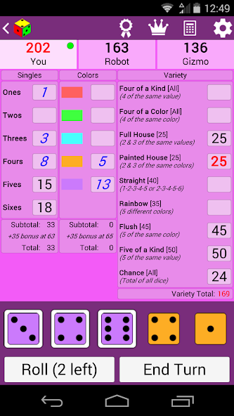 เป้าหมายคือการทำคะแนนคะแนนโดยการกลิ้งลูกเต๋าเพื่อสร้างชุดค่าผสมบางอย่าง ในแต่ละเทิร์นคุณได้รับอนุญาตให้ม้วนลูกเต๋าได้ถึง 3 ครั้งและสามารถเลือกลูกเต๋าที่จะถือก่อนที่จะรีดอีกครั้ง หลังจาก 3 ม้วน (หรือน้อยกว่าถ้าคุณตัดสินใจที่จะหยุด) คุณต้องเลือกหมวดหมู่บนดัชนีชี้วัดของคุณเพื่อกำหนดคะแนน แต่ละหมวดหมู่สามารถใช้ได้เพียงครั้งเดียว ผู้เล่นผลัดกันทำสิ่งนี้จนกว่าจะมีการใช้หมวดหมู่คะแนนทั้งหมดจากนั้นใครก็ตามที่ได้รับคะแนนสูงสุด คำแนะนำโดยละเอียดเพิ่มเติมรวมอยู่ในแอพ