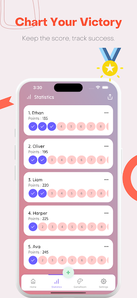 หนึ่งในคุณสมบัติที่สำคัญของแอพคือความสามารถในการป้อนคะแนนสำหรับผู้เล่นแต่ละคนในตอนท้ายของแต่ละรอบ จากนั้นแอพจะอัปเดตอันดับโดยอัตโนมัติเพื่อให้คุณสามารถดูได้ว่าใครเป็นผู้นำและยังมีงานต้องทำ แอพนี้ยังเก็บสถิติที่มีรายละเอียดเกี่ยวกับการแสดงของผู้เล่นแต่ละคนทำให้ง่ายต่อการดูว่าใครทำงานได้ดีอย่างต่อเนื่องและผู้ที่อาจต้องก้าวขึ้นเกมของพวกเขา