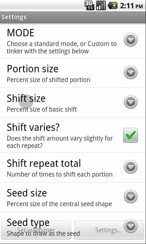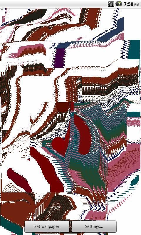 วอลล์เปเปอร์สดนี้ทำให้การสะกดจิตที่สวยงามเปลี่ยนรูปทรงออร์แกนิกและพื้นผิว มันเหมือนโคมไฟลาวาเศษส่วน คุณสามารถเข้าสู่การตั้งค่าเพื่อเปลี่ยนโหมด (คลาวด์ผ้าหรืออาเกต) หรือทำโหมดของคุณเองโดยการซ่อมแซมด้วยพารามิเตอร์