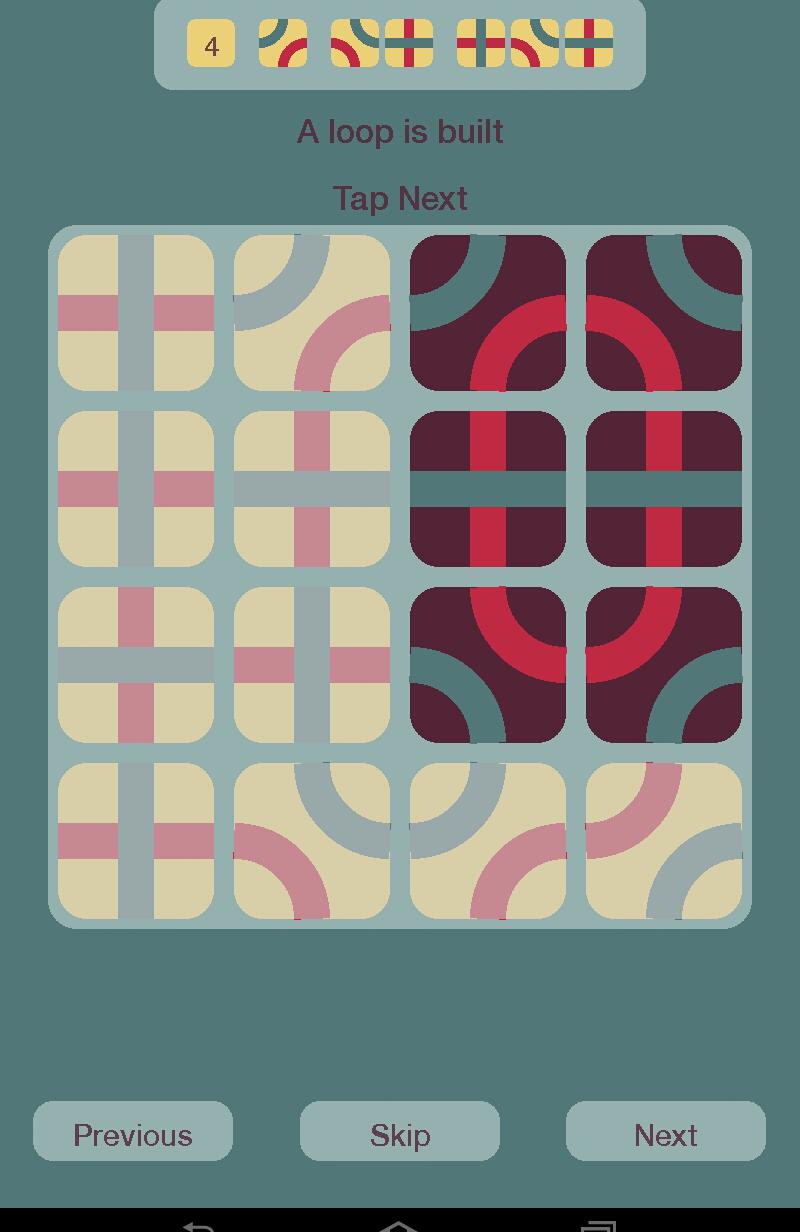 The objective of the game is to complete as many loops of a single colour as possible with the tiles displayed before the time runs out by rotating, swapping and sliding the tiles. Visual dexterity is the key.