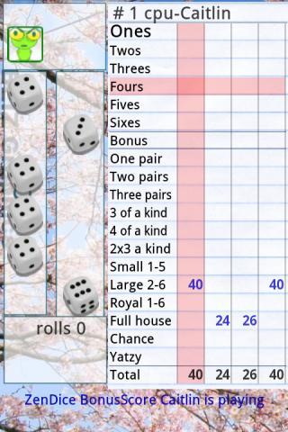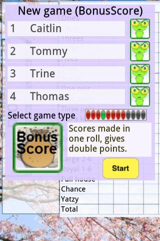 Because there are tons of different rule variations, there is an option to choose the version that your family played when you were growing up. Select your game type from "Normal" (three rolls), "Easy" (four rolls), "TopDown" (you get four rolls, but you have to score everything from the top of the score sheet from ones down to Yatzy in sequence), "BonusScore" (in which scores in the lower section made in one roll receive double points), "RollSaver" (unused rolls are passed to the next round), "5-dice Classic", "NordicClassic" games or an easy variation of BonusScore and RollSaver games with 4 rolls.
