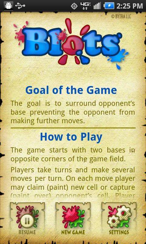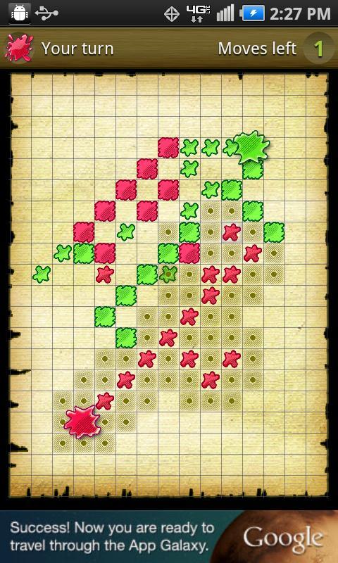 游戏从游戏场的另一个角落开始。玩家轮流并每回合采取多个动作。在每次移动期间,玩家都可以要求(油漆)新的单元格或捕获(绘制)对手的牢房。当您的对手无处可移动时 - 您赢了!
