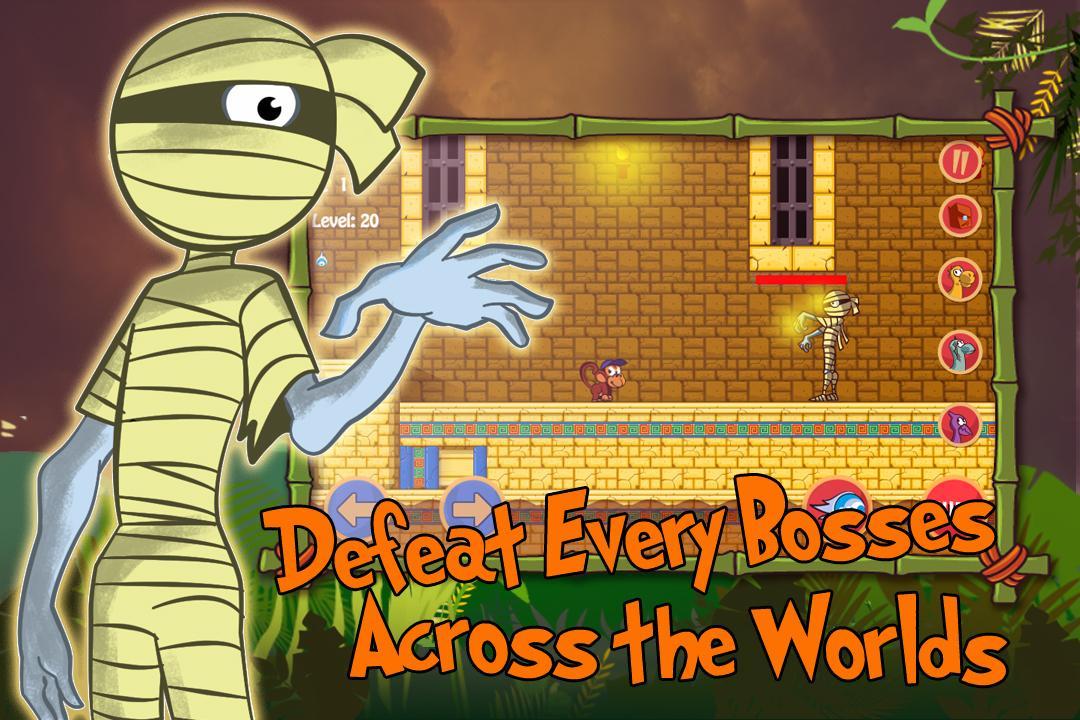 Super Monkey由不同的游戏水平制成;每个都是独特的,具有新的挑战水平和令人敬畏的动态。在每个世界的最后层面上,英雄将不得不以不同的力量和能力击败最终的老板……让他赢得战斗!