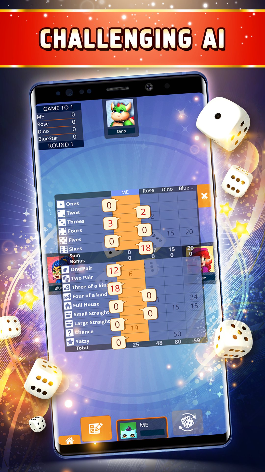 如果您無法與朋友一起玩 Yatzy 或 Yatzy 多人遊戲,您有機會與我們具有挑戰性的機器人來衡量您的技能,並學習不同的策略,這些策略在玩 Yatzy 在線遊戲時會很有用。 Yatzy 是一款適合所有技能水平的骰子遊戲。無論您是初學者還是專業人士,我們的 Yatzy 免費離線遊戲都非常適合您!